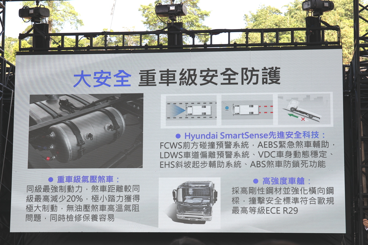 QT500大霸王搭載重車級氣壓煞車系統,氣壓強勁制動力可減低約20%煞車距離,亦無傳統油壓煞車高溫氣阻問題,對於日常高負重下的行駛有效煞停至為重要,加上同級唯一氣壓手煞車,並採用高剛性鋼材強化橫向鋼樑,撞擊安全標準符合歐規最高等級ECE R29,安全性大幅提升。領先加入Hyundai SmartSense先進主動安全科技,包含LDWS車道偏離預警、EHS斜坡起步輔助、FCWS前方碰撞預警、AEBS緊急煞車輔助、VDC車身動態穩定、ABS煞車防鎖死以及法規標準配備四路行車紀錄器、數位行車記錄儀等,強化每趟運途駕駛與行人的安全。