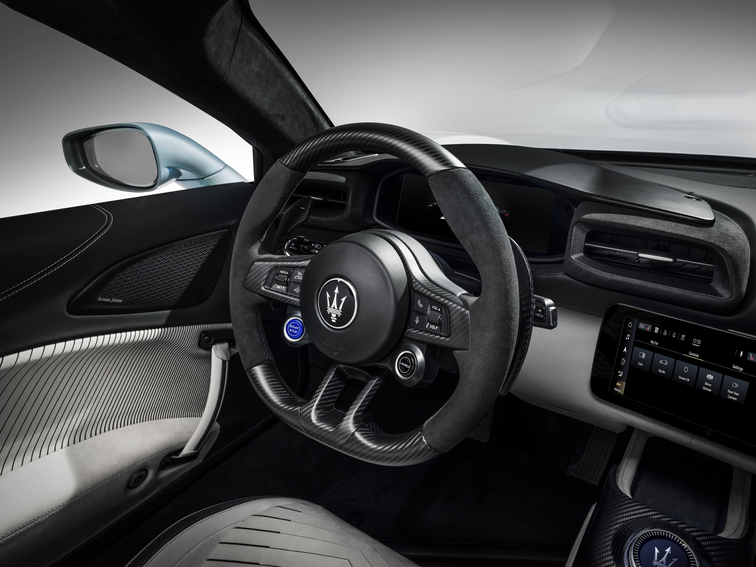MC20 Cielo 外觀擁有與 MC20 如出一轍的俐落線條,從車頭延續至車尾都能感受到一致的家族風格。車室氛圍營造上,MC20 Cielo 運用Alcantara® 和 Full Premium 頂級皮革拼接打造整體內裝和包覆性絕佳的桶型座椅;採用 Alcantara® 碳纖維多功能方向盤搭配新世代藍色引擎啟動按鈕設計,為整體競速格調增添更多運動感。中央鞍座以簡潔而直覺的鋪陳將車輛控制功能整合於2組 10.25 吋液晶螢幕,中央僅保留俐落的功能化按鈕,為駕駛提供心無旁鶩的行車氛圍。
