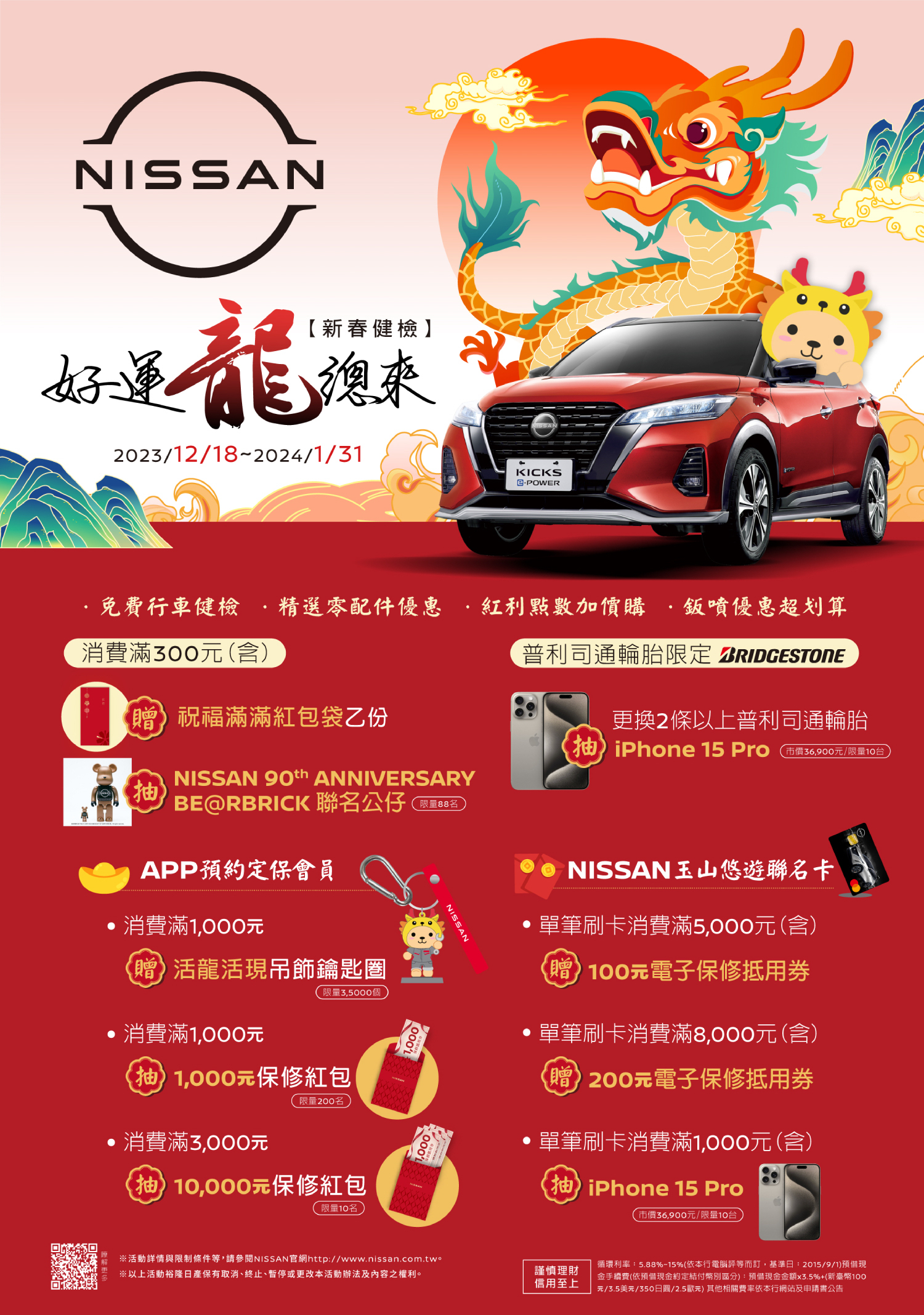 為慶祝NISSAN品牌 90週年,於NISSAN 2024「好運龍總來,新春健檢」春節健檢活動期間,車主凡回廠消費滿300元,即可參加NISSAN原廠與庫柏力克熊合作的NISSAN 90th ANNIVERSARY BE@RBRICK限量聯名公仔(建議售價4,999元)抽獎活動,同時可獲贈NISSAN祝福滿滿紅包袋乙份;若使用NISSAN Care APP預約回廠定保消費滿1,000元,加贈NISSAN活龍活現吊飾鑰匙圈乙個(註2) ,同時可參加1,000元保修紅包抽獎活動,滿3,000元可參加10,000元保修紅包抽獎活動(註3),為您的新年開啟聚財大門。