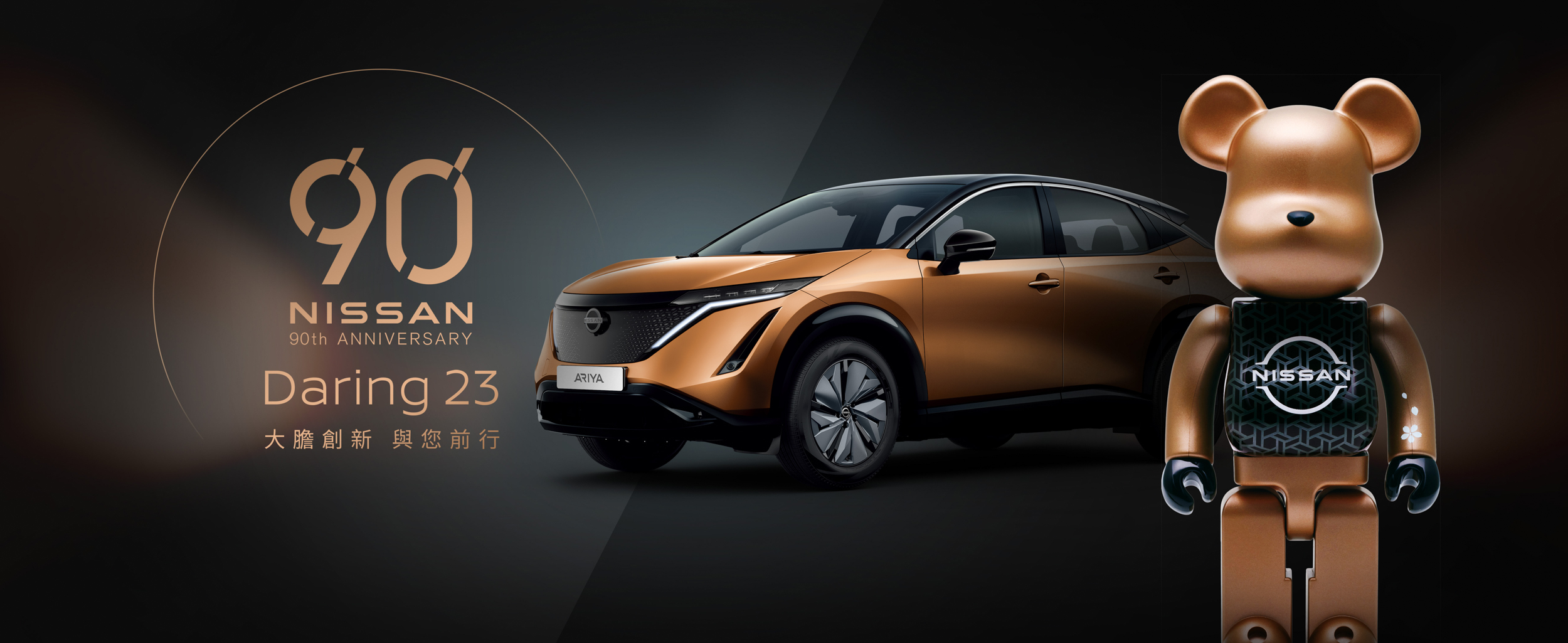 為慶祝NISSAN 90周年,2024台北車展期間推出NISSAN 90th ANNIVERSARY BE@RBRICKS (庫柏力克熊)聯名公仔,每組包含100%比例與400%比例各一隻,NISSAN 90th ANNIVERSARY BE@RBRICK 以ARIYA電動車象徵日出的金銅塗裝配色設計,身體以日式「組子」幾何圖紋為底,搭配NISSAN 品牌LOGO及90周年紀念LOGO,另左手以櫻花妝點,傳遞現代而簡約的日系藝術美學。車展期間每日現場限量販售5組(註7),每組售價新台幣4,999元,每日10:00-13:00 於NISSAN展區發放當日購買號碼牌,並於13:23公開抽出認購名單共5名,歡迎粉絲朋友珍藏擁有。