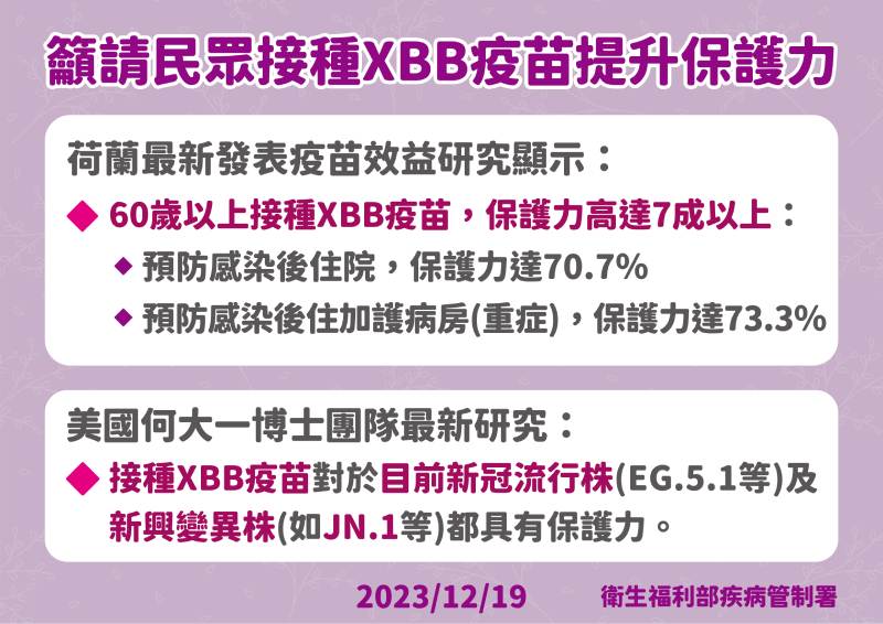 除了接種XBB疫苗外,疾管署也呼籲,民眾應持續落實手部衛生及咳嗽禮節等衛生習慣,年長者、免疫低下者外出或於人潮聚集且無法保持適當距離、通風不良之場所,以及在與年長者或免疫低下者密切接觸時,都建議要戴口罩維護自身健康。
