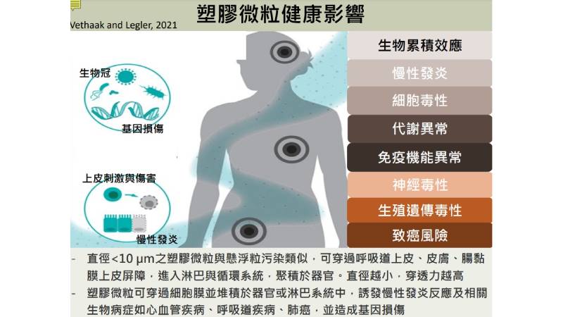 ▲塑膠可能透過吸入、食入、接觸進入人體,造成眾多危害。(台大公衛團隊提供)