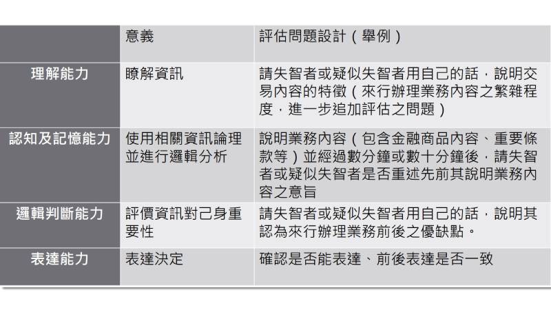 (三)如確認失智者或疑似失智者未受監護宣告或輔助宣告時,銀行宜依「理解能力」、「記憶能力」、「邏輯思考能力」及「表達溝通能力」等4個層次,評估其於辦理業務時之意思能力有所欠缺或不足之情形,參考做法如下: