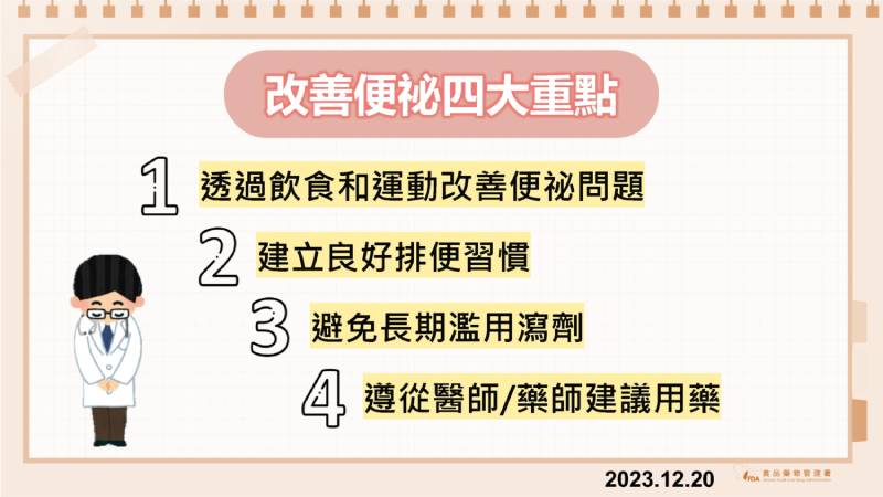 食藥署副署長陳惠芳表示,為有效根除便秘問題,可遵從下列重點: