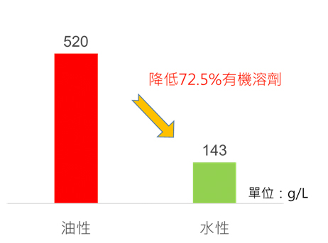 自2021年1月起陸續開始使用,已在2023年10月完成全台TOYOTA板噴據點(81個服務廠)使用水性金油,大幅降低揮發性有機溶劑72.5%,預估2024年可以減少67,101公升揮發性有機溶劑排放,且水性金油噴槍清洗可以直接使用水,不需使用揮發性有機溶劑清洗,一年減少揮發性有機溶劑38,067公升的使用量,友善環境。