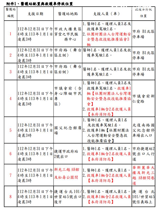 鑑於往年民眾熱情參與跨年晚會,人潮眾多,市府1樓東區大廳市民服務中心(1號醫護站)設置傷病患留觀區,並於活動場地周邊設立7站醫護站(上方置可夜視並標有十字之標示)。北市衛生局也提醒民眾,醫護站是提供緊急醫療救護的場所,請勿因疲憊或其他非緊急因素久留,以免影響真正需要救護的民眾。請配合於市政府及現場工作人員引導下進場,避免推擠。