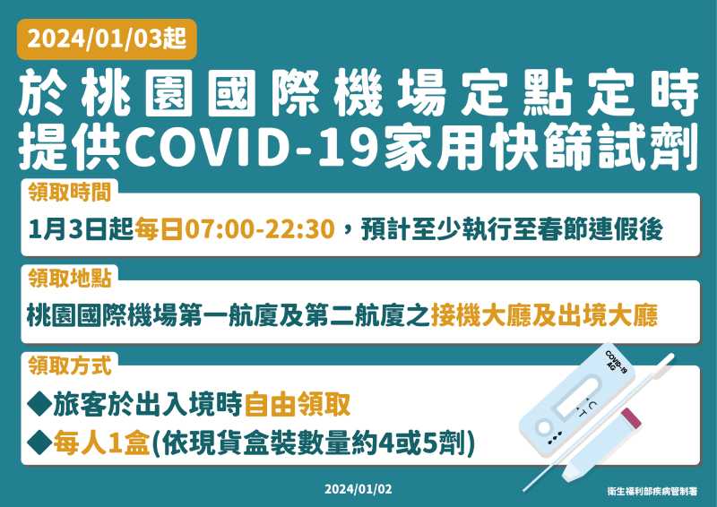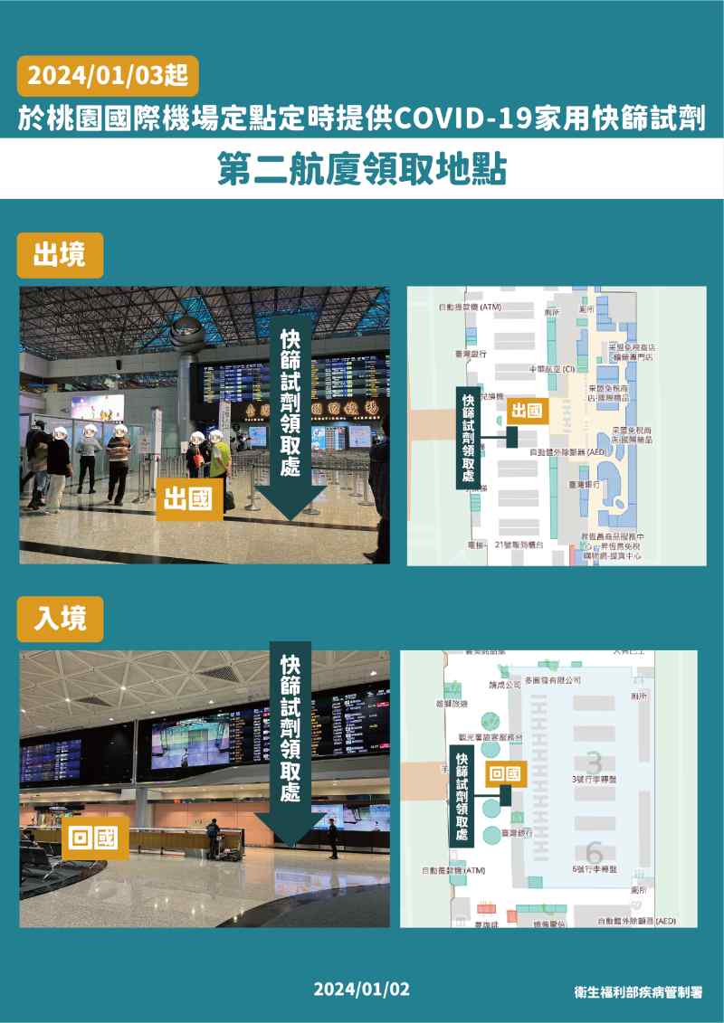 疾管署表示,COVID-19家用快篩提供時間,為每日上午7時至晚間10時30分,共有4個據點,分別於桃園國際機場第一航廈、第二航廈的接機大廳及出境大廳。