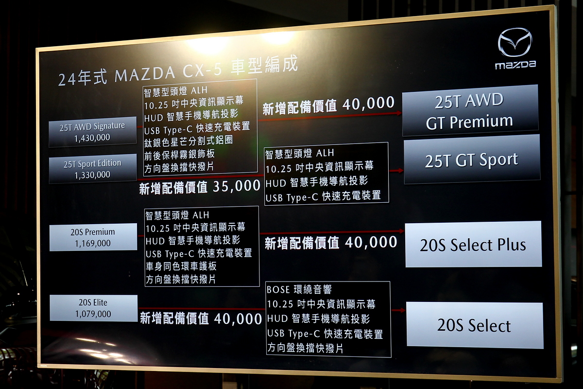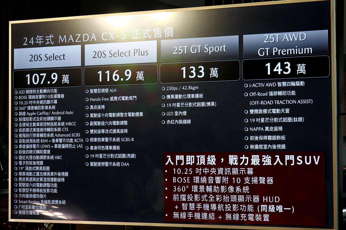 台灣馬自達於今日(1/4)推出 24 年式CX-5,除外觀與內裝質感全面精進,入門車型 20S Select 售價 107.9 萬元即配置 360°環景輔助系統、BOSE環繞音響、 10.25 吋中控螢幕、投影式全彩 HUD 支援智慧型手機導航顯示與 USB Type-C充電裝置,全車系配備升級總價值最高達 4 萬元,以強化配備、維持售價的模式回饋消費者的支持。