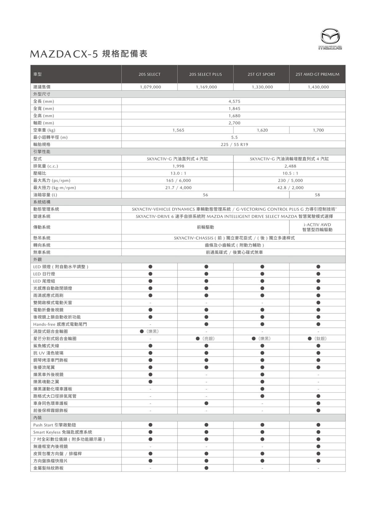 Mazda 擁有最齊全的 SUV 產品陣容,而 CX-5 作為品牌熱銷主力車型,以眾多當代先進科技的加持深得車主的心,如效能出色的 Skyactiv 動能科技、魂動設計美學、市場最完備的主被動安全科技 i-Activsense、以及 25T Skyactiv-G 強悍動力整合 i-ACTIV AWD 智慧型四輪驅動提供人馬一体獨特駕馭樂趣,都是 Mazda CX-5 穩居銷售前茅的原因。