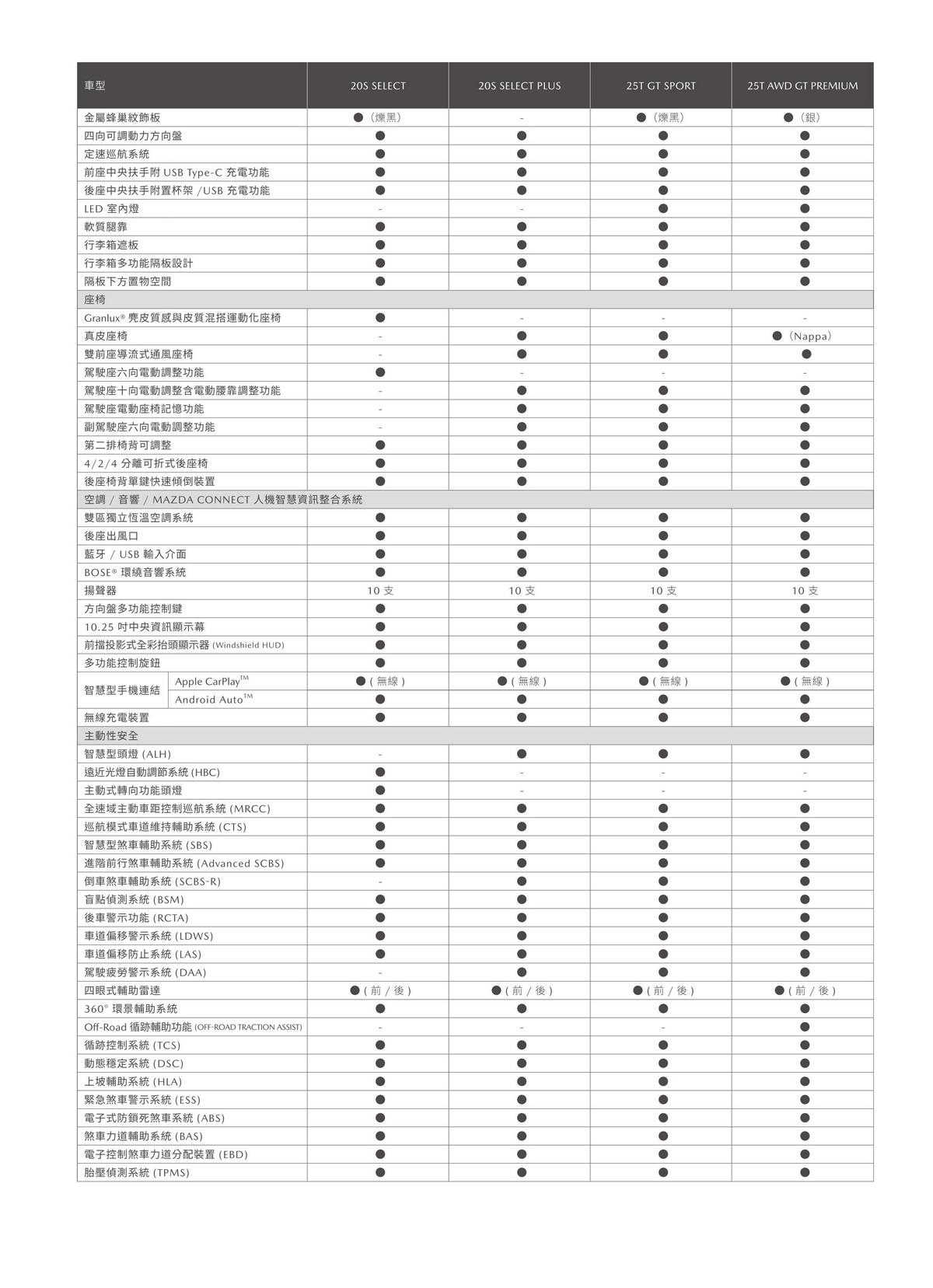 24 年式 Mazda CX-5 全車系升級畫質更細膩的 10.25 吋中央資訊顯示幕,自入門車款 20S Select 即標配 360o 環景輔助系統、BOSE® 環繞音響附 10 支揚聲器、方向盤換檔快撥片、無線充電裝置、無線 Apple CarPlayTM、USB Type-C 高功率充電裝置、以及級距內唯一配置的前擋投影式全彩抬頭顯示器支援智慧型手機導航投影功能。而 20S Select Plus 以上車型更標配 ALH 智慧型頭燈,除了可以依據不同的行駛路況及車速,自動切換各種照明模式,結合防眩光模式能偵測對向來車、前方車輛尾燈及亮度,自動調整光型以確保提供清晰的行車視野,讓日夜行駛皆能更加安心。