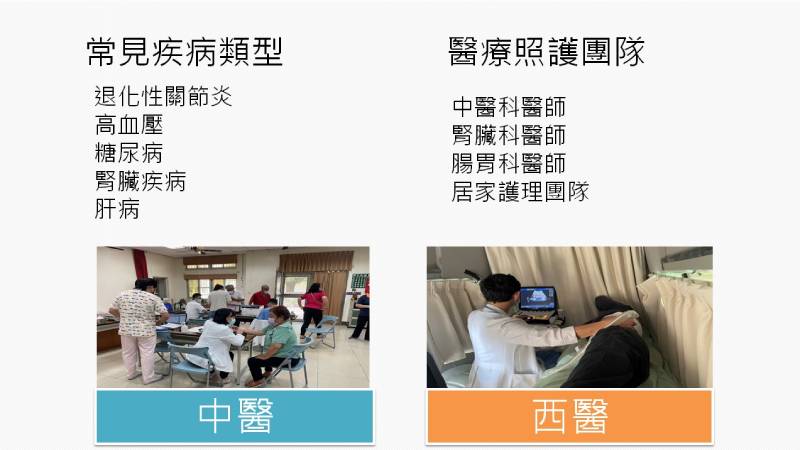 以部立台南醫院新化分院為例,該院提供台南市境內老年人口佔31%的左鎮區中西聯合門診的駐診服務。中醫醫療服務包括針灸、中藥,西醫醫療服務則有巡迴超音波車。一位90歲陳姓阿公因疾病及年邁鮮少外出,導致社交體力衰退迅速,困難獨自行走,造成四肢多處跌倒外傷。幾次中醫針灸看診,醫病間建立信任感,雖然阿公什麼事都忘記了,但「總是記得要來針灸……」