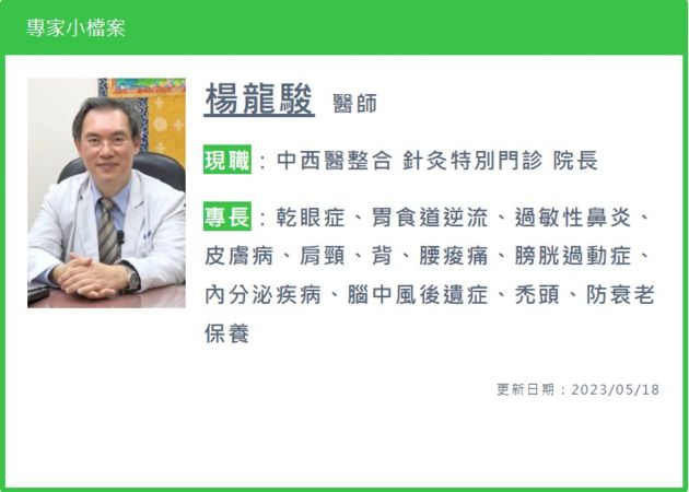 楊龍駿醫師提到,這名男性患者幾乎每天都要去醫院急診報到,家屬認為這樣下去不是辦法,因此患者便前來針灸門診尋求治療,在第一次針灸後,病人表示隔天狀況很好,只是有時還會有暈眩的問題,但在第二次治療後就沒有明顯的暈眩,連續治療約一個療程後患者已經痊癒,並回到工作岡位上。