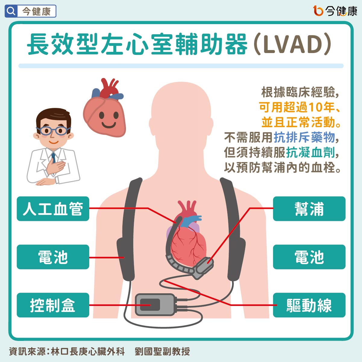 長效型左心室輔助器是一種小型植入式設備,人工幫浦可完全埋在胸腔中,僅以一條電源線由腹部穿出體外,連接到固定電源或可攜式電池,將含氧血液從左心室經由人工血管輸送到身體的其他部位,幫助患者進行血液循環。根據臨床經驗,長效型左心室輔助器可以使用超過10年,期間病人可以正常活動,不需要服用抗排斥藥物,但須持續使用抗凝血劑,預防幫助幫浦內血栓。