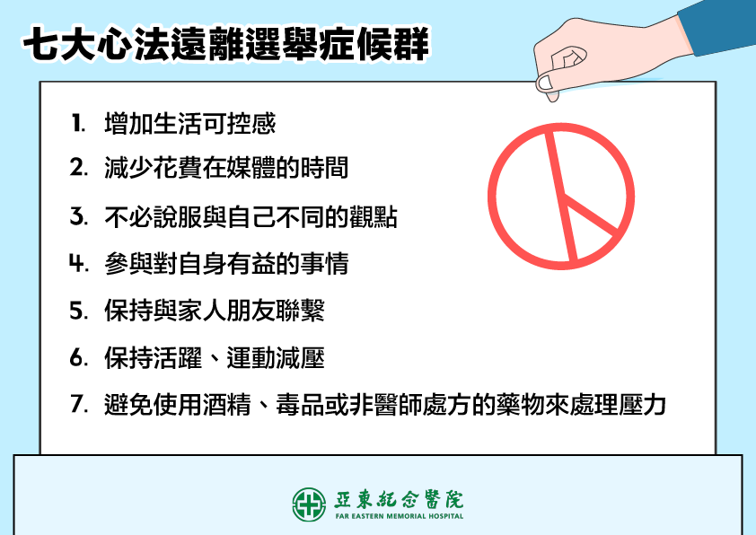 - 若遇上選舉相關的談話,不必說服與自己不同的觀點,且練習簡單的話語結束對話。