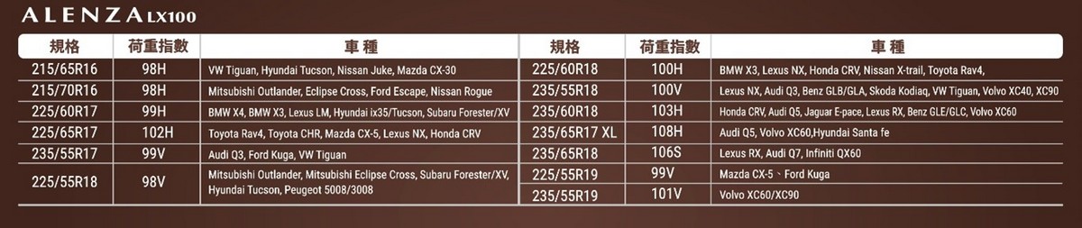 在Alenza LX100加入Alenza家族之後,將與Alenza 001組成強力組合。針對注重日常通勤與出行乘駕舒適性的車主,Alenza LX100身懷多項靜音技術運用,旨在發揮超越同級產品的靜音效果及乘坐舒適性;對於常駕車出遊與在意操控性能的車主,Alenza 001高剛性圓弧溝槽設計與3D M型溝槽花紋,著重於乾、濕地的操控與煞車性能。 Alenza LX100與001兩者於各自擅長領域的整體表現均屬強悍,讓台灣SUV消費者可依自身需求來進行挑選。Alenza LX100新品相關資訊請參見日本普利司通官網:https://lihi2.com/k5nug