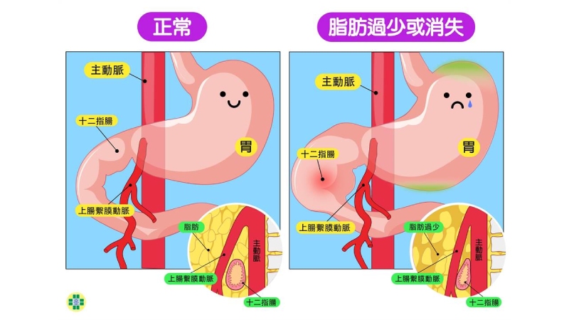 林隆煌表示,上腸繫膜動脈症候群(superior mesenteric artery syndrome)是罕見的上消化道阻塞疾病。當上腸繫膜動脈(SMA)壓迫腹主動脈(AA),會導致十二指腸內容物不能順利排入空腸,無法獲得適當的營養,導致體重減輕和營養不良。病因與後腹腔脂肪或結締組織流失有關,例如癌症、嚴重外傷、營養吸收不良症,或厭食症等,人變得太瘦、脂肪消失,使得腸子被血管夾住;在受傷或脊柱手術後被放置在身體石膏中的患者也會出現SMA綜合症,又稱為石膏症候群;另外也有解剖位置異常,使得十二指腸懸吊太高或上腸繫膜動脈起源處過低,都增加十二指腸被夾住的機率。