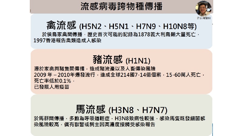 流感病毒跨物種傳播十分需要關注,目前常見禽流感如H5N2、H5N1、H7N9、H10N8等、豬流感H1N1、馬流感H3N8、H7N7。其中禽流感主要在候鳥與家禽中流行;豬流感源於家禽與豬隻間傳播,由於豬隻與人類生活環境關係密切,當豬隻感染禽流感,同時又帶有哺乳類的流感抗原時,就有可能產生新病毒,進而傳染給人類造成大流行;馬流感於馬群間傳播,多數為呼吸道輕症,H3N8致病性較強,感染馬隻併發細菌感染風險較高,偶有獸醫或飼主因高濃度接觸受感染報告。