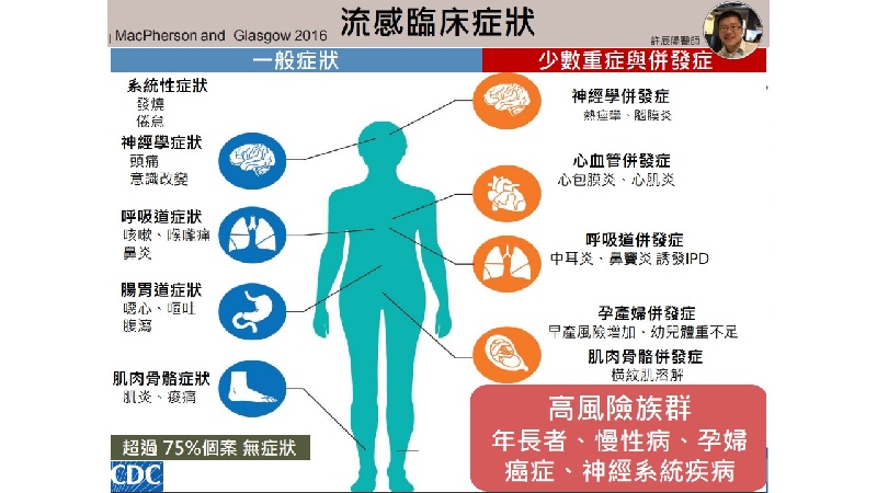 許辰陽醫師表示,大多數感染流感的病患都屬於輕症,如發燒、倦怠、頭痛、咳嗽,甚至噁心嘔吐、骨骼肌肉痠痛等一般症狀,少數患者會出現重症或併發症如熱痙攣、腦膜炎、心肌炎等症狀;孕婦可能會有早產風險等。