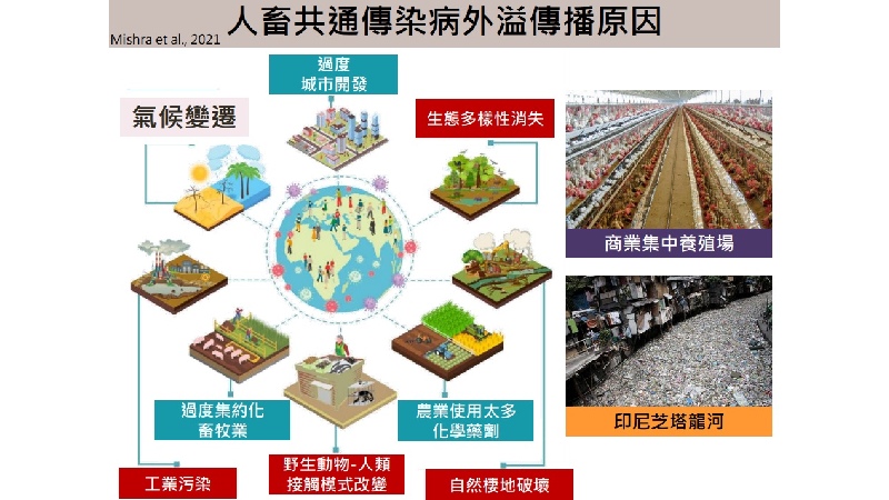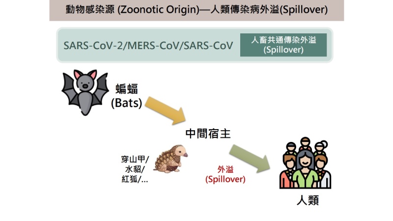 全球大流行人畜共通傳染病毒包含:H1N1、茲卡、伊波拉、MERS等,因生態環境問題,病毒傳播至不同物種之間,基因重組機率越來越高。研究發現,蝙蝠身上帶有多種病毒,通常不會直接傳染給人類,而是先感染中間宿主如:穿山甲、水貂、紅狐等,產生病毒基因重組,利用新變種病毒傳給人類,由人類大量散播這些病毒,即所謂外溢效益(Spillover)。
