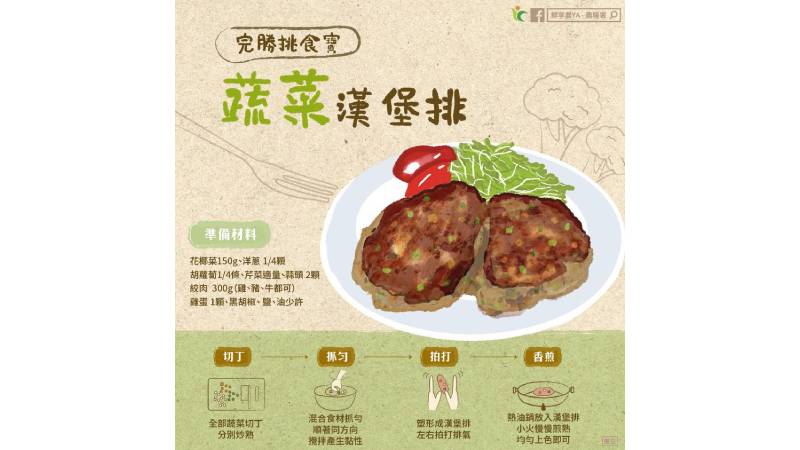 【健康醫療網/記者鄭宜芬報導】「紅蘿蔔好臭!我不要吃」根據統計,僅7% 的國小孩童蔬果攝取量達標。適逢過年大魚大肉、零食塞滿嘴,更讓家長擔心纖維攝取不足、「卡嗯嗯」的狀況。農糧署在粉專「鮮享農YA - 農糧署」分享蔬菜漢堡排食譜,巧妙融入多種蔬菜,讓孩子不知不覺就吃進營養健康的青菜,美味一百分。