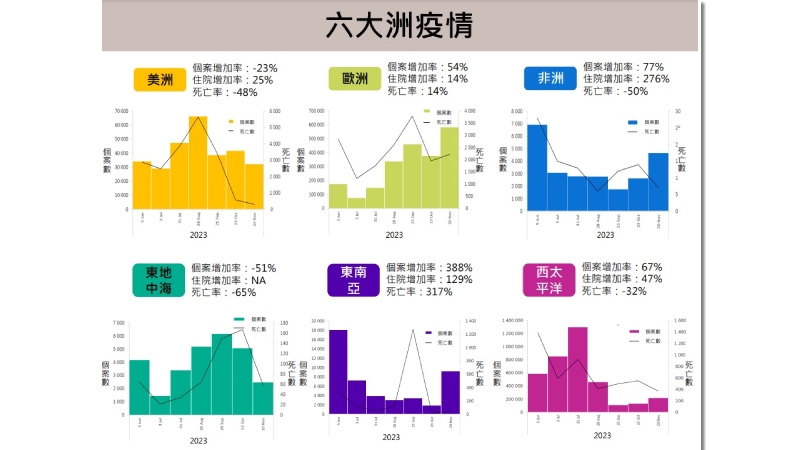 全球包括台灣,亞變種病毒XBB的分布越來越減少,EG.5與JN.1正竄升中,國際間受到JN.1變種病毒侵襲,導致新一波疫情流行,美國、歐洲、新加坡及馬來西亞等地住院率皆有上升趨勢。