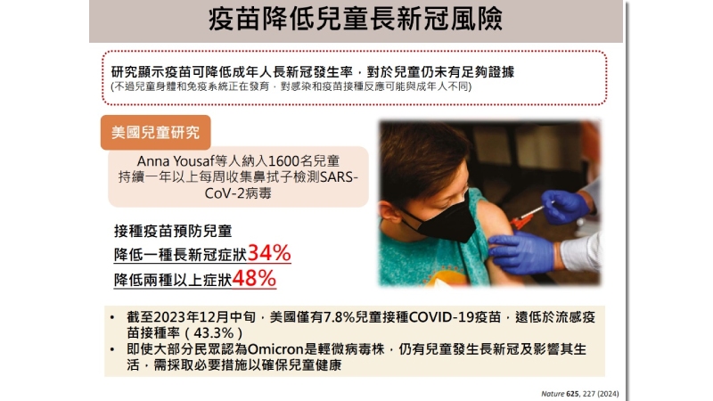 此外,兒童長新冠一直是社會關心議題,《自然》(Nature)發表美國一項兒童研究,納入1600名兒童,持續1年以上每周收集鼻拭子檢測SARS-CoV-2病毒。結果發現,接種疫苗可使兒童降低1種長新冠症狀34%、降低2種以上症狀48%,顯示疫苗對兒童長新冠具保護作用。【影片這裡看】