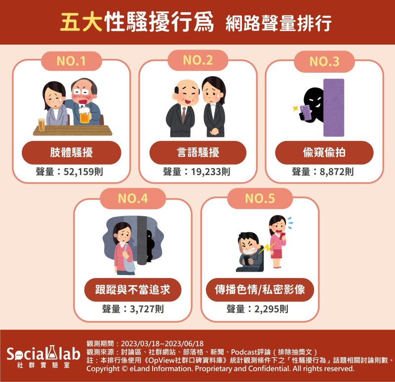 ▲ 網友熱議構成性騷擾的五大行為網路聲量排行。(Social Lab社群實驗室提供)