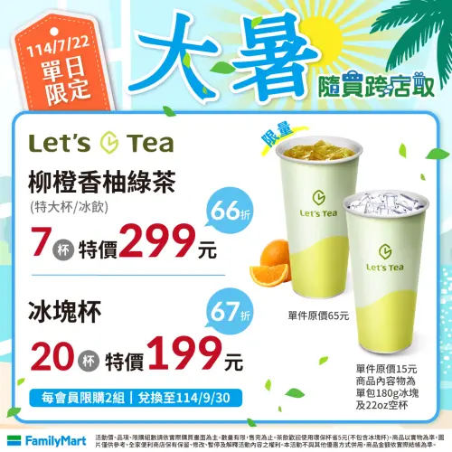 迎接大暑節氣登場,全家會員APP限時一日加碼,7月22日上午10:00開賣「大暑一日限定」飲品組合,共有5款多杯數組合,優惠最低6折起,會員限購2組,兌換期限至今年9月30日。