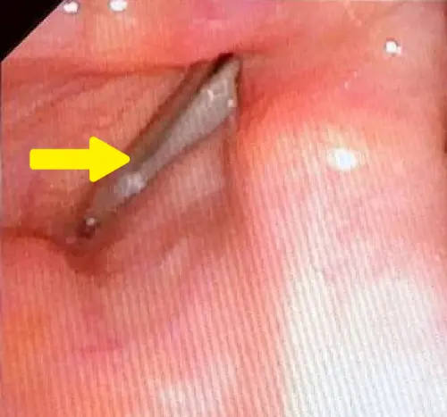 ▲▼手術前(上)左側假聲帶會過度用力代償且聲帶無法閉合,手術後(下)左側假聲帶不用再出力且聲帶可閉合。(圖/馬偕醫院提供)