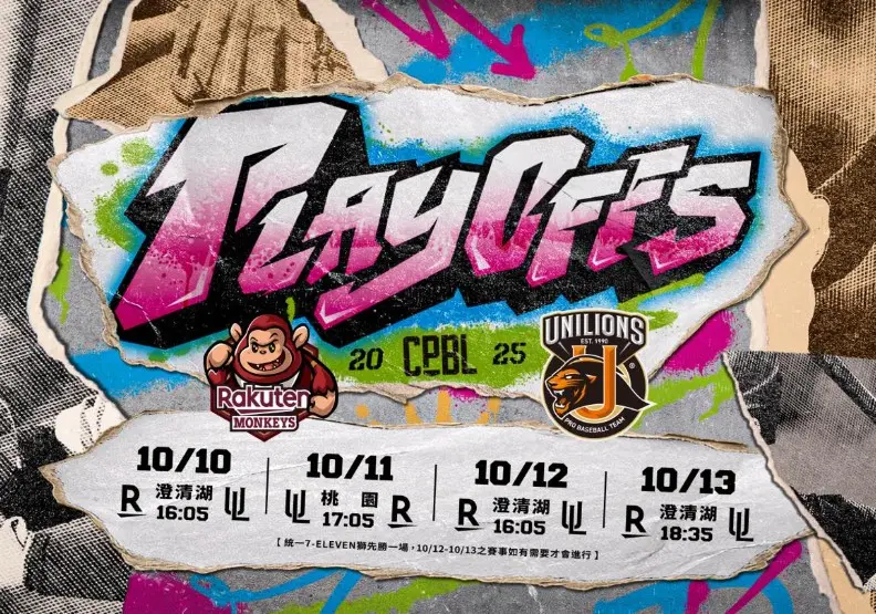 | Game4 | 10月13日(一) | 18:35 | 樂天桃猿 @ 統一 7-ELEVEn 獅(如有需要) | 高雄市立澄清湖棒球場 |