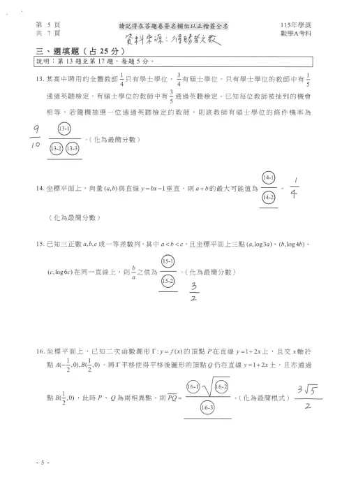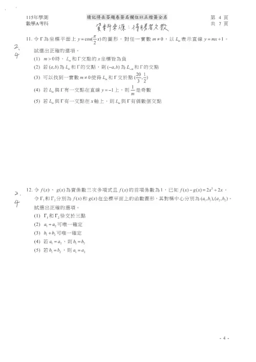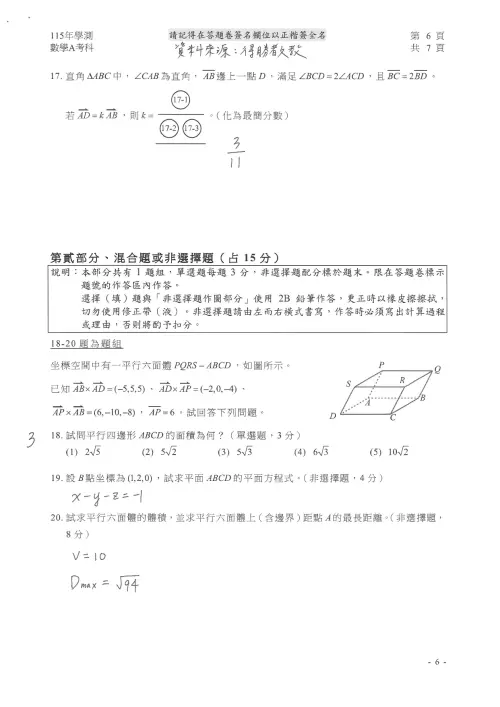 🟡115學測數A題目、115學測數學A答案