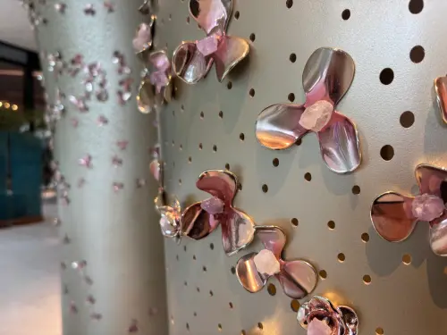 ▲▼連牆面都極盡奢華!大廳牆面鑲嵌水晶,絕美裙襬造型牆後方,竟巧妙隱藏著公共女廁。(圖/記者徐銘穗攝)