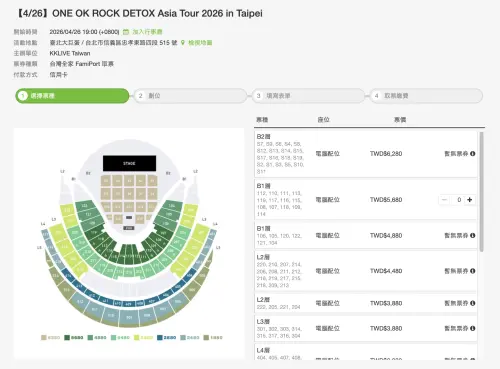 日本搖滾天團ONE OK ROCK確定於2026年4月25日、26日連續2天站上台北大巨蛋舉辦《ONE OK ROCK DETOX Asia Tour 2026 in Taipei》演唱會,成為首組登上台灣最高指標演出場地的日本藝人。主辦單位先前宣布加開4月26日場次,加場門票今(7)日中午12點正式於KKTIX、全家便利商店FamiPort全面開賣,也同步釋出首場未完成結帳的回流清票,但實測發現,加場的門票非常好買,截至12點半還點的到票,與首場盛況形成反差。