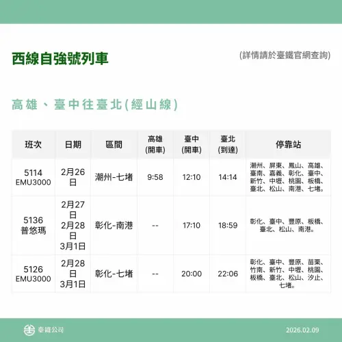 此次再加開班次自今年2月11日(三)零時起同步開放網路、台鐵e訂通、超商及電話語音訂票,歡迎旅客多加利用。