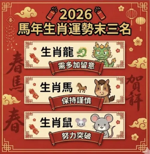 2026馬年生肖運勢排行出爐!知名命理師謝沅瑾以專業、親切形象深植人心,學術版圖之廣,備受民眾敬重,日前他接受《NOWNEWS今日新聞》訪問,分析2026馬年生肖運勢以及2026馬年國家運勢流年,直指生肖屬鼠運勢於最末位,受犯太歲正沖影響劇烈,整年度壓力大、需注意行車安全;反觀屬羊於新年度有豐富貴人運,整體運勢、財運豐收,穩健經營都沒問題,成為2026馬年最旺的生肖。