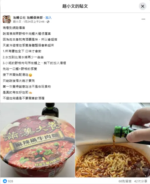 有網友分析,該款麻辣鍋牛肉泡麵本身即帶有酒釀與發酵風味基底,使湯頭除了辛香辣感外,仍保留回甘特色;當草本系酒款加入後,不僅豐富了湯底的滋味,同時調和原本鮮明的辣感,使口感更圓潤順口,意外讓這碗經典泡麵多了一種「高級吃法」。