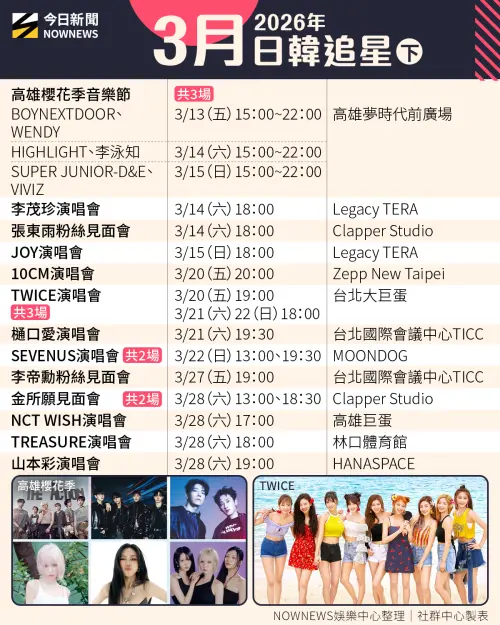 2026年3月台灣追星行程再度全面失控,從韓團大隊回歸、人氣樂團巡演,到櫻花季音樂節與多場簽售、見面會同步開跑,台北大巨蛋、林口體育館、台北國際會議中心TICC、Legacy系列場館、高雄巨蛋一路排到月底幾乎沒有空檔,尤其誇張的是有8組日韓星3月7日當天都在台灣,再加上i-dle、TWICE三天攻占大巨蛋、櫻花季3天連炸,《NOWNEWS今日新聞》一次幫你整理3月追星懶人包,行程表先截圖,請假單記得先請好。