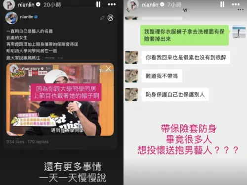 林倪安透過社群Threads指出,該名男子私生活混亂,經常以藝人身分邀約女性,且口袋、包包、車上到處放滿保險套,「他約出門都是有目的,千萬不要喝他的酒或抽他的煙。」也曝光一張該名男子遮住部分臉部、上節目的照片,引發熱議。
