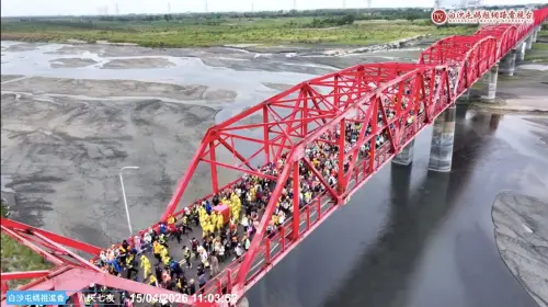 白沙屯媽祖持續南下前往北港進香,15日上午11時隊伍抵達西螺大橋,準備跨越濁水溪進入雲林。雖然西螺大橋因進行鋼構補強工程自去年12月起封閉,但配合年度宗教盛事,彰化縣政府特別在媽祖通行前臨時開放橋面,但僅限轎班、信眾徒步通行,即使今年採人車分道方式,空拍畫面仍可見萬名信徒擠爆西螺大橋,經典的「紅橋人龍」壯觀畫面再現。